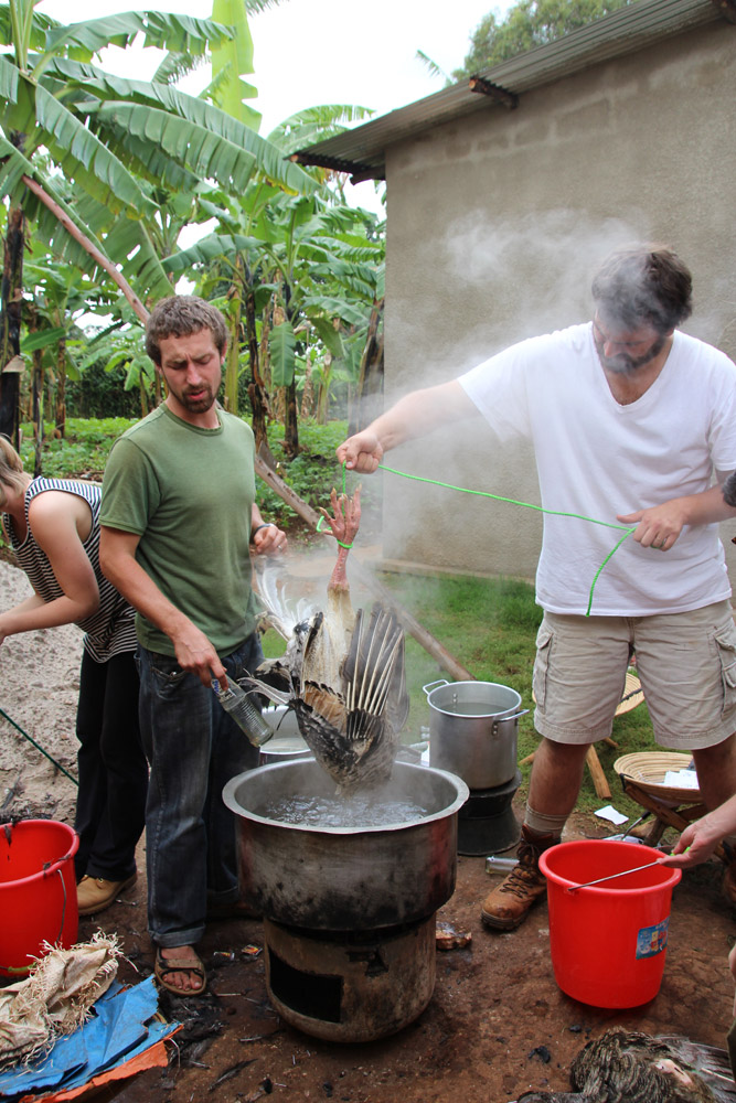 Training ended about a week after Thanksgiving. It was our training group’s first holiday away from our families and we all spent the holiday together. We were allowed to cook our own Thanksgiving meal, which was the first American food we had eaten in three months. However, cooking in Rwanda isn’t the same as in America. We couldn’t just go to Wal-Mart and buy a frozen turkey. JD, our Program Director, showed up the day before with 8 live turkeys. We slaughtered them ourselves, which was a very new experience for all of us. It took us a couple of tries to efficiently kill them. It was as humane as we could manage as inexperienced butchers. We plucked them, and I personally dressed (gutted) about 5 of them. I will never forget the smell.