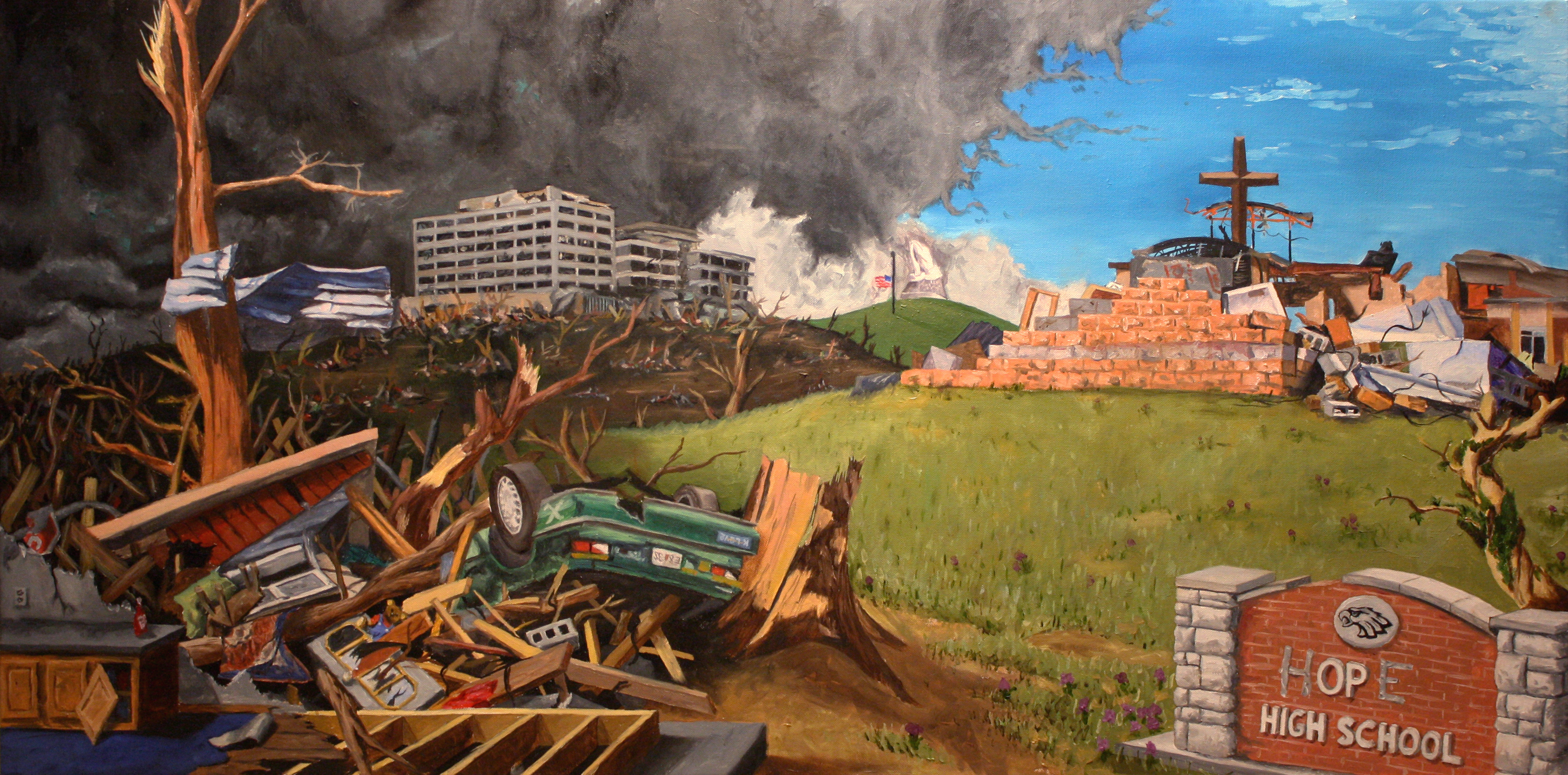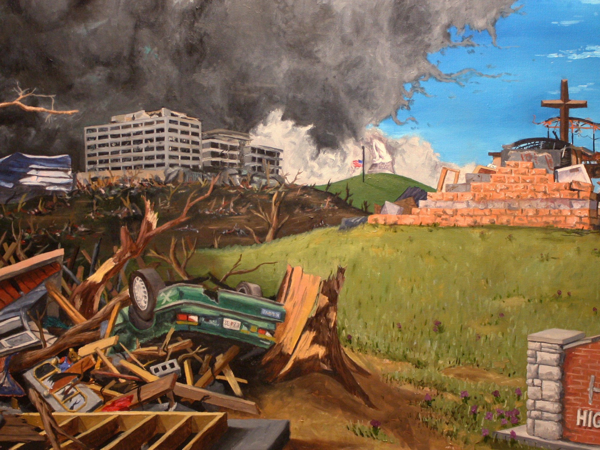 While I was painting the aftermath of the Joplin Tornado the trees started to have new growth. When I saw how similar they were to Ruisdael’s blasted Elm, I included his tree in the painting. It is on the right-hand side of the painting behind the Joplin High School sign.