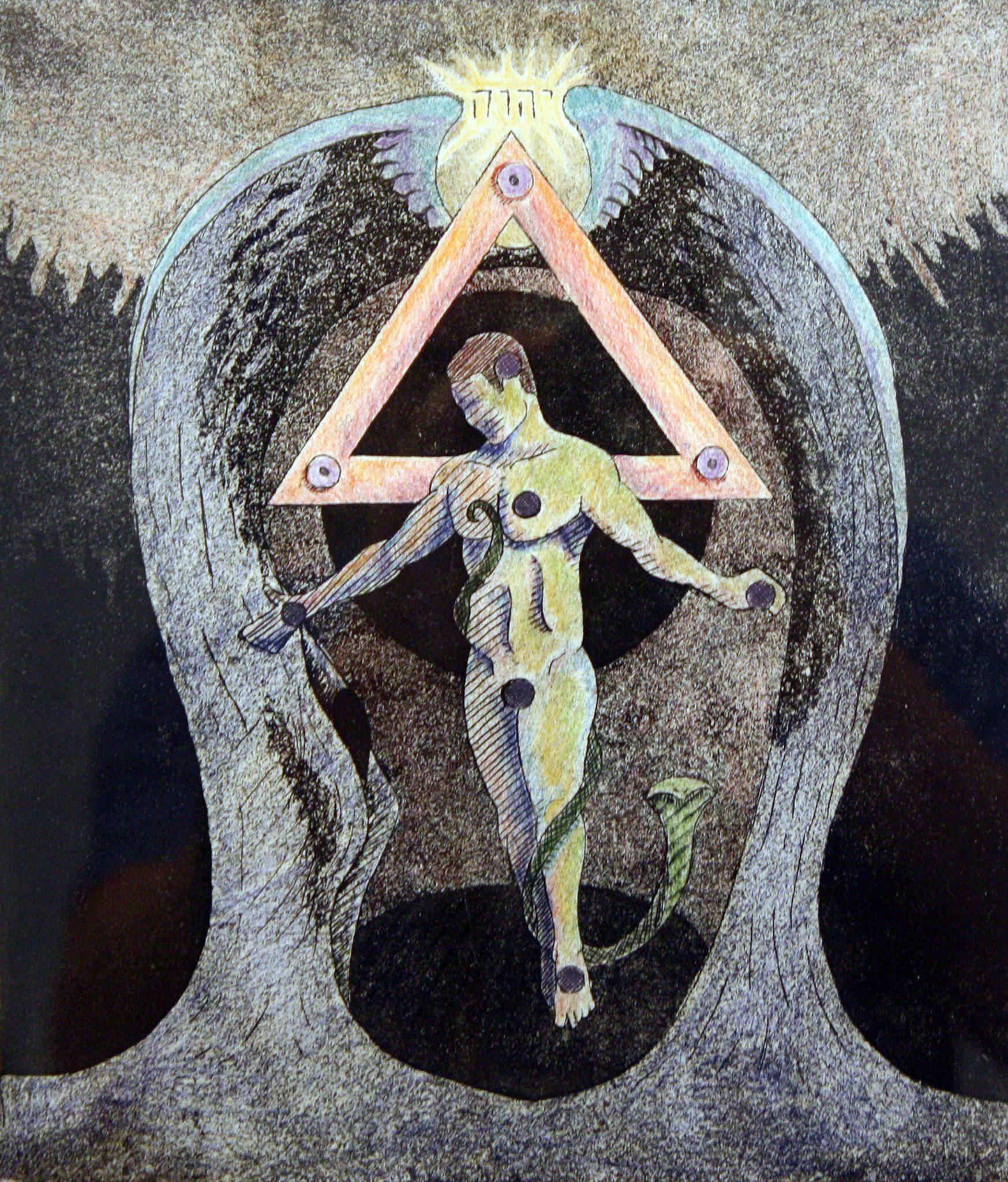 Here is an etching that I made a few years ago to represent the Kabbalic tree of life. At the top is the Hebrew YHVH. I would need a separate post to explain this image and what it means.