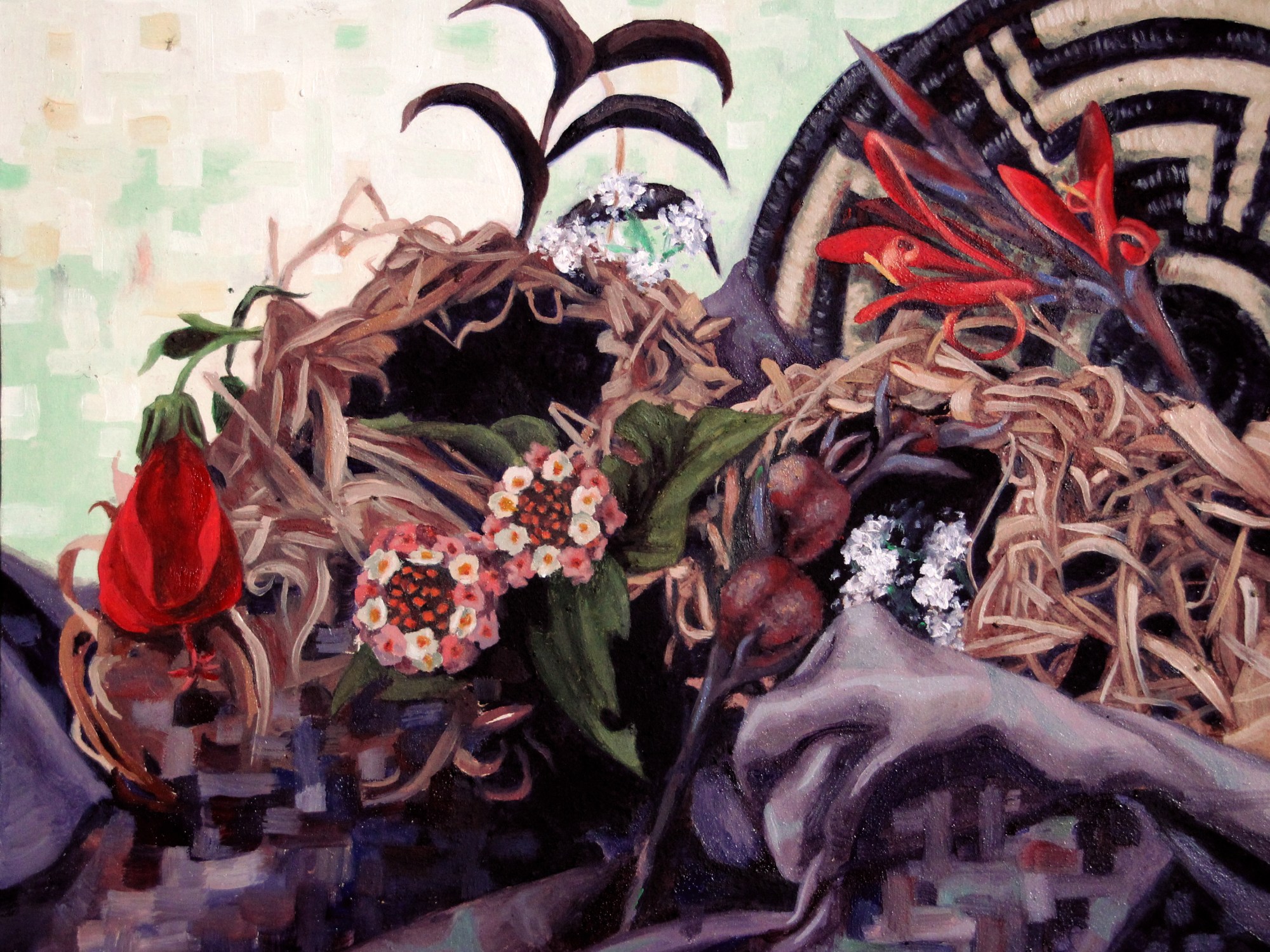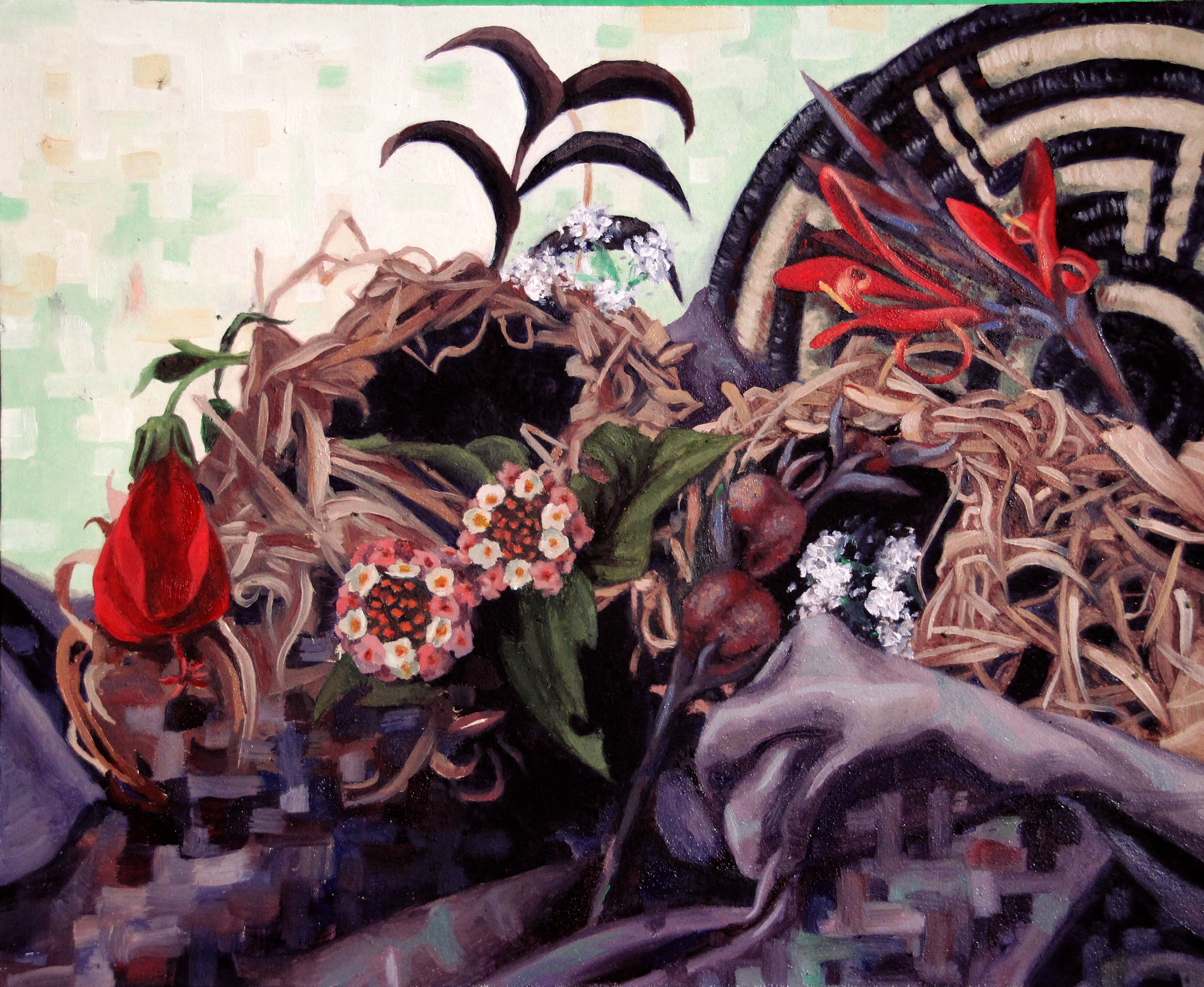 Male weaver birds build the nests for the females. When they finish the nest a female will come and inspect it. If they like the nest then they mate with the male and lay eggs inside. If they do not approve of the nest then they will detach the nest from the tree and the male must start over. I collected two of the rejected nests and took them home to make this still life.